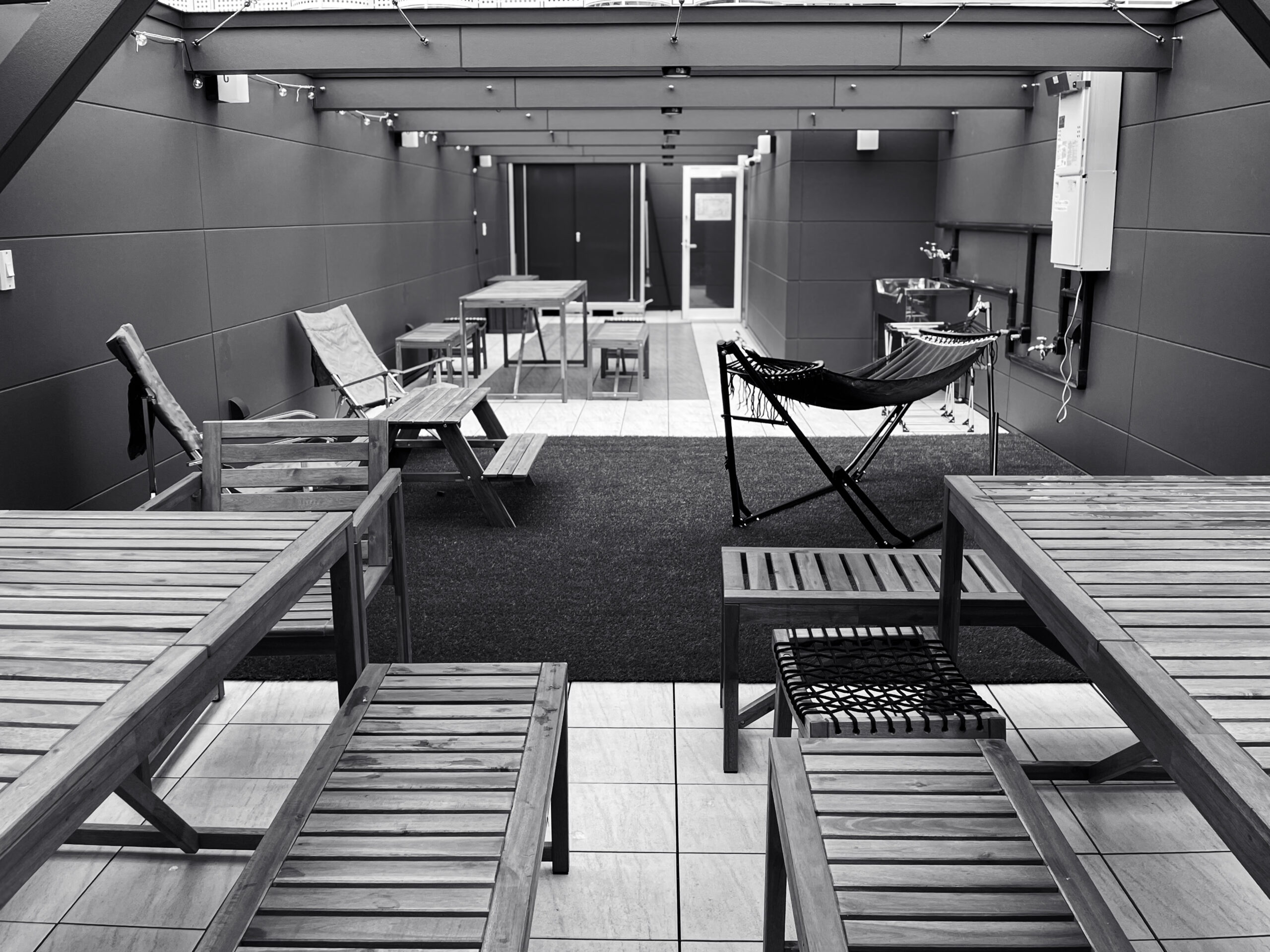 ビル風の抜ける屋上で、心地よく過ごせます。大型扇風機もご用意しておりますので暑さもやわらぎます。